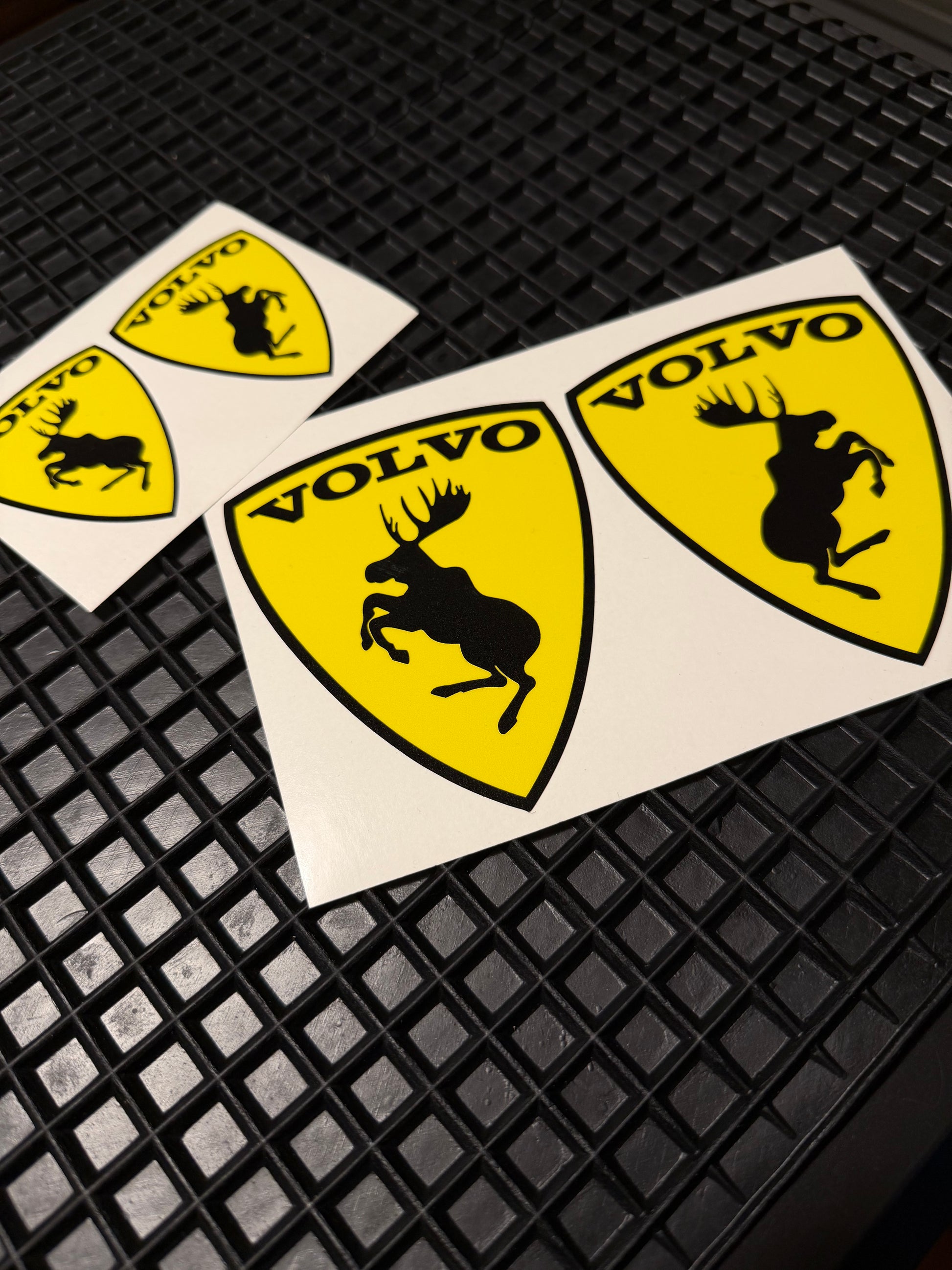 Volvo hirvitarra kiiltävä, säänkestävä kiiltävälaminoitu muovitarra. Saatavilla kahdessa eri koossa.